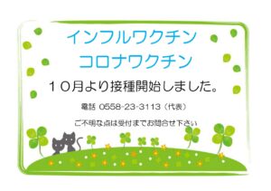 10月より、インフルエンザワクチン・コロナワクチンの接種を開始しました。